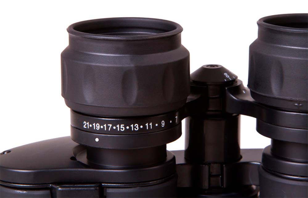 Панкратический бинокль обеспечивает увеличение от 7 до 21 крат. Оптическая схема построена на призмах Porro. Линзы сделаны из стекла марки BK-7. На них нанесено полное просветляющее покрытие – это сводит к минимуму потери света, прибор передает четкое, яркое изображение с насыщенными цветами.Межзрачковое расстояние регулируется в пределах от 58 до 72 мм, предусмотрена возможность диоптрийной коррекции. Зрительный прибор можно быстро навести на резкость с помощью колеса центральной фокусировки.