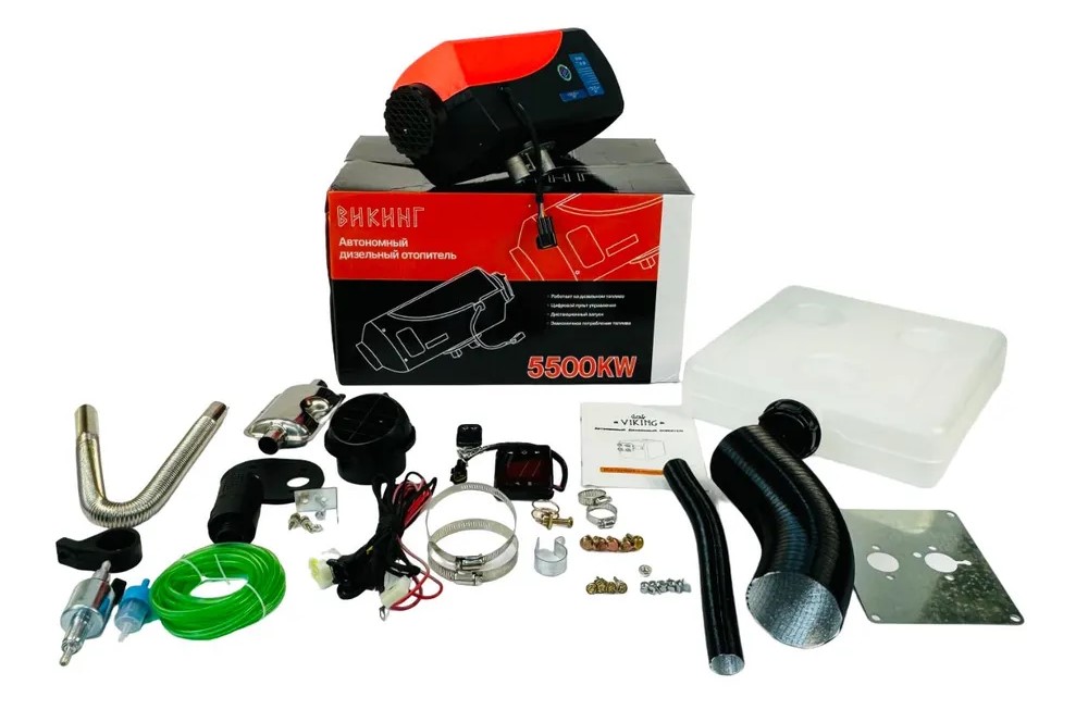 Viking Autonomous Diesel Heater 5.5kW 12V/24V-1 Plastic Black/Red – это автономный дизельный отопитель. Он представляет собой термовентилятор с камерой сгорания воздушно-топливной смеси, окруженной металлической рубашкой. Мощность устройства составляет 5.5 кВт, оно работает от напряжения 12 и 24 В. Отопитель предназначен для поддержания комфортных температурных условий в салоне или кабине в холодные месяцы года. Оснащён климат-контролем, поддерживающим заданную температуру без необходимости ручной регулировки. Управление осуществляется через корпус или дистанционный пульт, работающий на расстоянии до 50 м. Запуск происходит после разогрева свечей накаливания, занимающего 3–5 минут. Комплектация: сухой фен, проводка, пластиковый бак под топливо, площадка для корпуса печки, выхлопная и выпускная труба, труба подачи нагретого воздуха, топливный насос, воздушный фильтр, топливный фильтр, топливопровод, блок управления, брелок дист. запуска, хомуты, крепеж, глушитель, инструкция на русском языке.