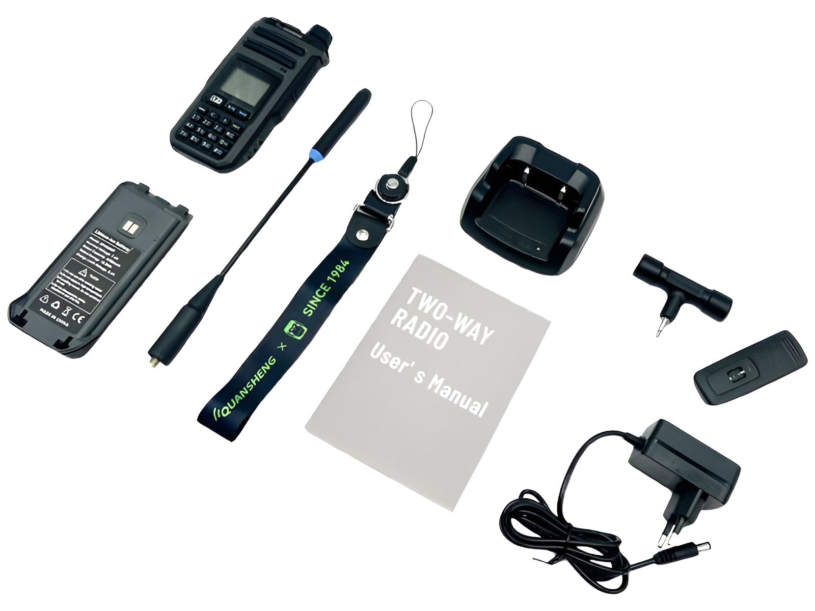 В комплект поставки Quansheng TK11(5) 10W 2500mAh Type-C входит само устройство, аккумулятор, антенна, приемник, клипса на пояс, зарядное устройство, ремешок для ношения на руке и инструкция на английском языке.