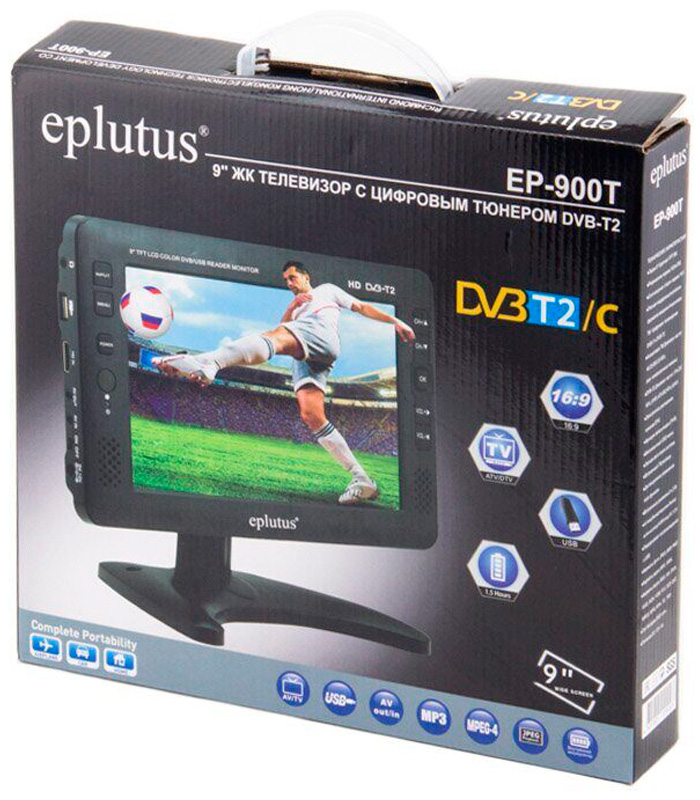 Eplutus 9" LCD TV EP-900T – это автомобильный компактный телевизор с ЖК 9-дюймовым экраном, который позволяет просматривать телепередачи как в традиционном аналоговом стандарте, так и в современном отечественном формате Т2, формируя качественное цветное изображение с разрешением 1024х768. Благодаря наличию в комплекте адаптеров питания 220В 50 Гц, 12В 1А и собственной аккумуляторной батареи емкостью 3000 мАч, телеприемник удобен в использовании в автомобилях, дачных коттеджах, малоразмерных помещениях и в путешествиях вне населенных пунктов. Надлежащее качество звука со стереофоническим эффектом здесь обеспечивается за счет пары встроенных 2-ватных динамиков. Штатный разъем USB помогает без добавочных устройств воспроизводить на экране телевизора аудио-, фото- и видеофайлы со съемных цифровых носителей типа карт SD и USB. При наличии дополнительного приспособления приемник может закрепляться на стене помещения.